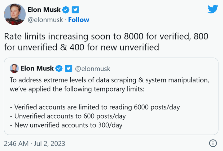 过了五个小时左右,马斯特再次发布推文,将限制修改为未验证用户每日 1000 条,验证用户每日 10000 条。