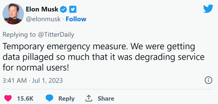 马斯克表示,这只是「临时紧急措施」、「我们的数据被大量掠夺,这已经影响到正常用户的服务了」。